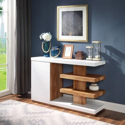 Bring a post-modern design touch to contemporary decor with the appealing minimalism of this three-piece accent table set that includes one coffee table, one end table, and one console table. The set features a cool two-tone wood and crisp white finish with geometric design elements that draw the eye and impart stylish refinement.
