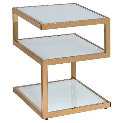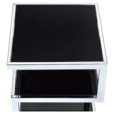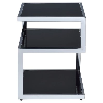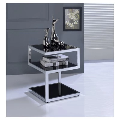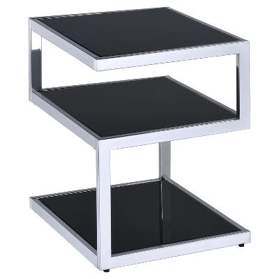 An Alyea End Table from Acme will add a striking accent to any contemporary space. This square end table is constructed with a simple yet eye-catching design, replete with sharp angles and a shiny, polished black and silver finish. This tiered end table provides plenty of visibility for books, light sources or any other contemporary decor.