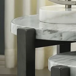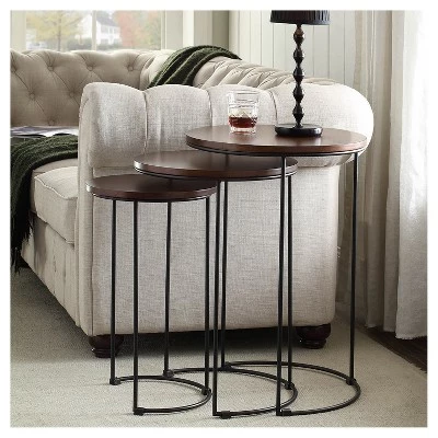 The Eloise Nesting Table Set is the most perfect set of nesting tables. Offering a touch of traditional appeal to your abode, this set showcases a powder coated metal frame awash in black and a circular tabletop boasting a chestnut finish. Save space by nesting them together, or split them up to accommodate guests. Scatter them around the room to hold drinks and hors d’oeuvres or arrange them in a stepped pattern to create a striking showcase for display.