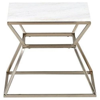 - Square marble print top and geometric metal base combine for a sleek modern look