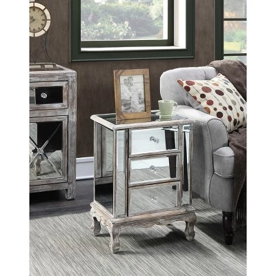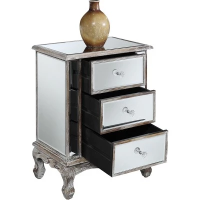 Add a touch of elegance and glam to your home with the Gold Coast Vineyard 3 Drawer Mirrored End Table by Breighton Home. Featuring 3 mirrored drawers with faux crystal rosette knobs that allow plenty of room for concealed storage. With traditional cabriole legs, mirrored glass panels and beautiful painted finish, this end table offers the best of traditional and contemporary styling. Available in multiple finishes from black and white to metallics, the Vineyard End Table will complement any decor, while also standing out. Look for coordinating items in the Gold Coast Collection available through Breighton Home, sold separately.