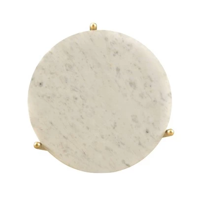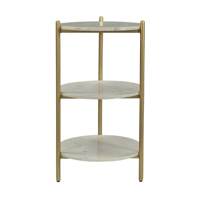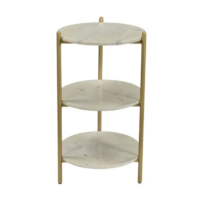 Three tiers of polished White Marble are held aloft on thin metal legs finished in a rich gold powder coating on this delightful Accent Table. The perfect size for that little nook in your kitchen, or to hold a couple candles and small baskets of soaps and lotions in your guest bath. And for your plants in that sunny spot, just perfect!