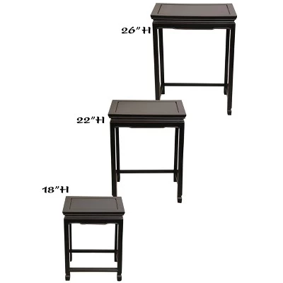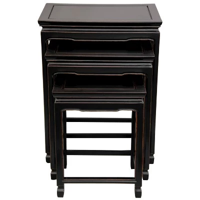 A fine quality set of three nested tables, convenient for drinks, snacking, or dining in the living room, family room, or office. They’re elegant decorative accessories, lending a subtle Asian accent with a beautiful distressed, antiqued black lacquer finish. The 3 descending table sizes can provide unique decorative stands for plants, planters, sculptures, photos, or curio display, as well as more traditional drinking and snacking.