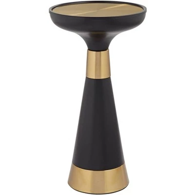 Sleek contrasting finishes highlight the Roxanne glam-luxe black and gold metal round side table. Made from metal, the table features a black finish offset by a gold finish. The round table top is perfect for storing personal belongings in your living room space.