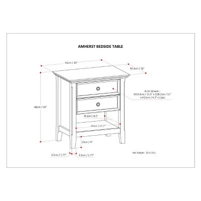 Halifax Solid Wood 24 inch Wide Traditional Bedside Nightstand Table. Can also be used in living or family rooms as end or side tables. Features two (2) spacious drawers and open bottom storage area. Handcrafted with care using the finest quality solid wood. Style includes elegantly tapered legs, molded crown edged table top, panel framed drawer fronts. . Efforts are made to reproduce accurate colors, variations in color may occur due to computer monitor and photography. The product is warranted to be free from defects in material and workmanship for a period of (1) year from the date of purchase to the original owner.