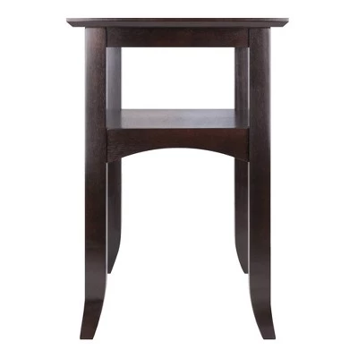 Gently flared legs and arched aprons add sweet touches to this traditionally-styled end table. And its solid wood construction in a rich Coffee finish will bring a natural appeal to any room in your home. Use the Camden End Table in the living room or bedroom to show off a table lamp or framed photos and have plenty of room on the shelf below for remotes and personal electronic devices, or for books and magazines. The rectangular shape allows for positioning that suits your furniture arrangement and room dimensions.
