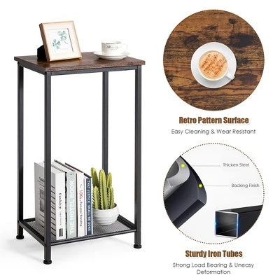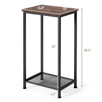 The end table combines beauty and practicability in one. A simple shape can integrate into any decoration style perfectly. Featuring particle board and steel frame, this table has high durability to provide a long time service for your family. Ample storage space, including desktop and lower shelf, provides enough space for you to place remote control, books, ornaments, etc. It not only can be a coffee table in living room or bedroom, but also can be an entrance table, office table, etc.. Specification: Color: Rustic Brown. Material: Particle Board, Steel. Dimension: 15.5” x 12” x 28.5”(L x W x H) . Weight: 9 lbs. Weight Capacity: About 66 lbs. Package Includes: . 1 x End Table. 1 x Instruction.