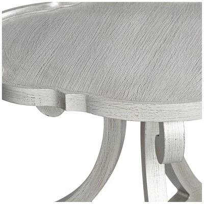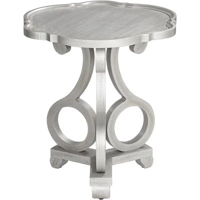 A charming addition to a classic sitting area, this scalloped side table is a wonderful choice. This table is adorned with three curvy legs that are sure to enchant. A brushed silver finish enhances a traditional look, while making it versatile enough for the contemporary home.