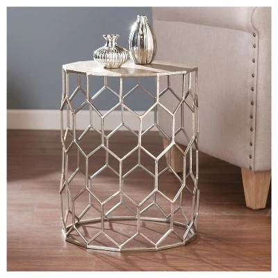 Geometry gets cool with the Aiden Lane Carmen Metal Accent Table. Polygon tabletop crowns honeycomb, hexagonal frame in this all metal side table. Place this eclectic accent table next to the sofa, reading chair, or entryway bench.