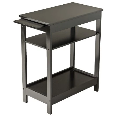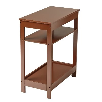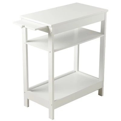 This table adds extra storage or display space to your home. You can use it as a side table, end table, or bedside table. It also adds interest to any room. Versatile table with slide out shelf also features two lower shelves. It provides storage and looks great anywhere in your home, as an end table for a living room, a nightstand for a bedroom and much more. By adding it as an accent table, you can update your dΓ©cor. It features a slim profile to fit in tight spots, but the small table expands when you pull out the hidden shelf. Decorative and practical, this extendable tray table with two shelves will be a great addition to your home. MDF and metal. Assembly required; assembly hardware included. 20″L x 11″W x 24″H