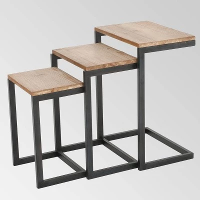 Expand the amount of table space your interior space has to offer without taking up extra room. Including three nested tables, this set offers incredible versatility whenever you need some extra table space. When your guests have gone and you need your living room back, you can simply tuck these tables together for easy storage. Featuring a wonderful C-shaped structure that is built from rich firwood and iron, this nested set will provide outstanding durability and style for years to come.MODERN INDUSTRIAL: Our nesting tables incorporate a powder-coated frame with sleek firwood to create an understated modern industrial design. Featuring smooth metal contrasted by natural wood, this set offers a chic aesthetic to any home.NESTING TABLES: This set of tables can be nested for easy storage when not in use. Cleverly designed to tuck into each other, this set also offers an exquisite structure that elevates the vibe of your decor.C-SHAPE DESIGN: Perfect for use while seated on the couch or in your favorite club chair, the C-shape design allows you to use our table set without any sacrificing leg room.FIRWOOD: The tabletops are created with refined firwood for a resilient structure that features straight, tight grains. This durable wood less prone to warping or twisting due to its dense nature.DIMENSIONS: Choose an accessory that is the perfect size for you and your furniture. The large table is 18.25β W x 12.75β D x 25.25β H, the middle table is 15.50β W x 11.50β D x 22.25β H, and the small table is 12.75β W x 10.25β D x 19.00β H. You will love how much your space can transform with the simple addition of this charming nesting table set.