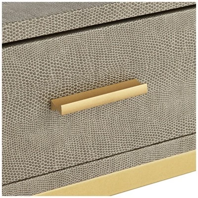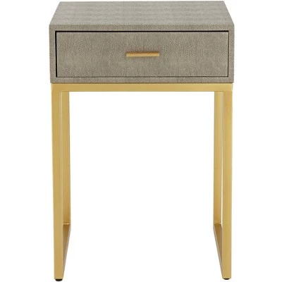 An open base and sleek drawer case create a compelling silhouette for this contemporary one-drawer side table. Perfect for a compact space in the living area or bedroom, the table boasts a gold finish metal base the brings airy lightness to complement an earthy gray faux shagreen leather tabletop and drawer. A single horizontal bar drawer pull in gold finish ties the piece together perfectly.