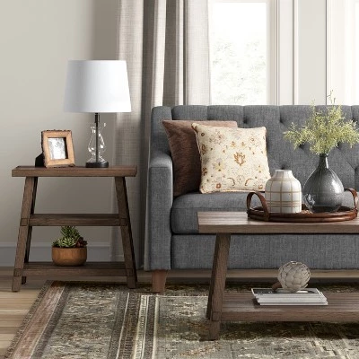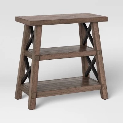 Whether kept beside a sofa or as an accent piece in an entryway or hallway, this Bourne Side Table from Threshold™ pairs seamlessly with a variety of different decor styles. Made from wood with “X” accents on either side and two open storage shelves, this angled side table is perfect to stash essentials and display decor with effortless style. Clean lines and a grainy rustic finish, this wood side table with shelves blends in perfectly with a variety of decors to meet your design needs.