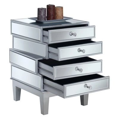 Bring a touch of elegance and glam to your home with the Gold Coast J Daniels End Table by Breighton Home. Featuring 4 asymmetrical drawers that allow plenty of space to hide away unsightly accessories remote controls or magazines. Mirrored glass panels paired with faux crystal rosette drawer knobs really pull this piece together. The staggered effect of the drawers gives this piece a unique yet classy contemporary design. Look for other items from the Gold Coast Collection from Breighton Home.