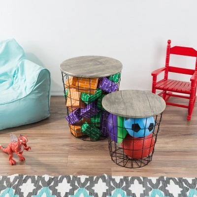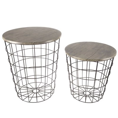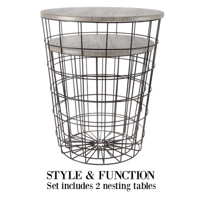 Organize your home with these stylish and practical Hastings Home Wire and Wood Nesting Tables. Stylish flared metal bases can be used with either end on the floor and double as their own storage solution. The gray wood grain veneer complements both rustic and industrial decor. Each set includes two nesting tables for everyday use in your living room, bedroom, or office.