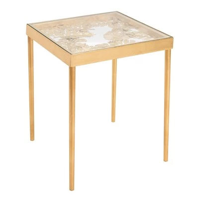 Inspired by the work of master artisans, this glamorous palm leaf side table brings instant savoir-faire to the living room. Finely crafted, its intricately sculpted palm designs are displayed beneath glass to highlight its timeless artistic style. The gold color adds to its a relaxing and lux design and exemplifies its stunning gold leaf finish. The clear glass top makes for a solid base for accessories such as lamps, books, and other belongings to be set upon. A truly lovely add to the living room.