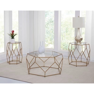 Light and airy, the Roxy Chairside End Table mixes metal and glass in an interesting hexagonal shape to add interest to your living space. The honeycomb gold powder-coated base adds glamour and the clear glass top allows the base to be the focal point. Also available in this collection are the matching cocktail table and end table (purchase separately). Your purchase includes one chairside end table.