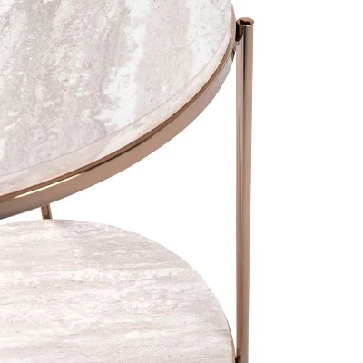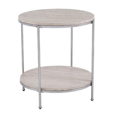 Round out your living room with the Aiden Lane Sula Round Faux Stone End Table. Faux travertine brings elegance, while metallic frame creates a sophisticated feel. Style and storage join forces with this side table.