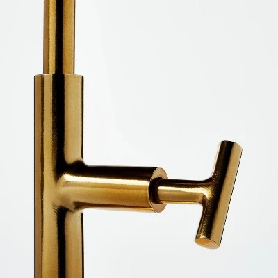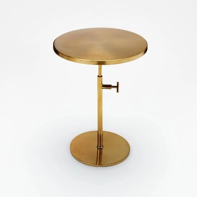 Spruce up the look of your decor by accenting it with this Adjustable Brass Accent Table from Thresholdβ’ designed with Studio McGee. Made from metal, this round accent table is supported by a pedestal base with adjusting hardware so you can change the height to suit your needs. The brass finish provides a standout look that easily integrates into most decor styles and color palettes. You can place this adjustable accent table near your sofa to keep your books and other items within reach while adding a decorative touch to your space.