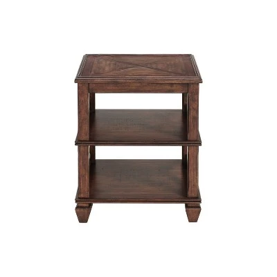 - End table shelves: top shelf is 16 inches W x 16 inches D x 7.75 inches H; bottom shelf is 16 inches W x 16 inches D x 8.75 inches H