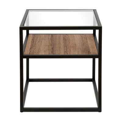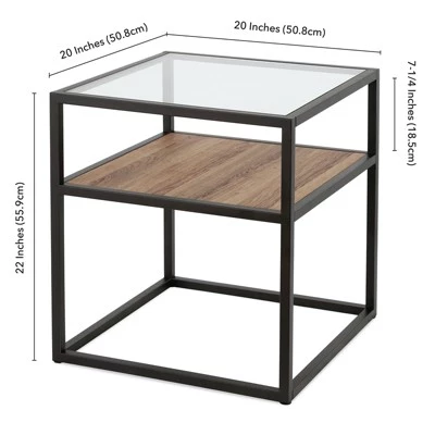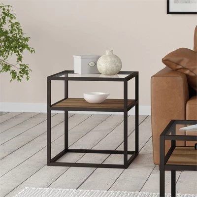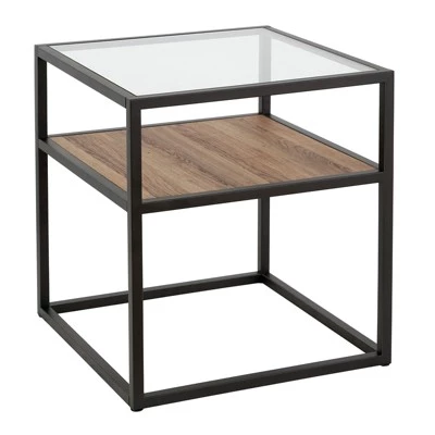 Simple and stylish, this industrial modern take on a classic design fits perfectly in any space.Β A seamless blend of mixed materials gives this table an industrial style that’ll make your space look warm and inviting. Easy to assemble and easy to style, the tempered glass top, oak shelf and blackened bronze finish make it the perfect addition to your living room or bedroom ensemble.Features : Tempered glass top.Engineered oak wood shelf.Features easy assembly.Weight capacity can support up to 35 LBS.Premium materials have been used in the making of this productSpecifications : Product Weight : 23.3 lbsFrame Material : Metal