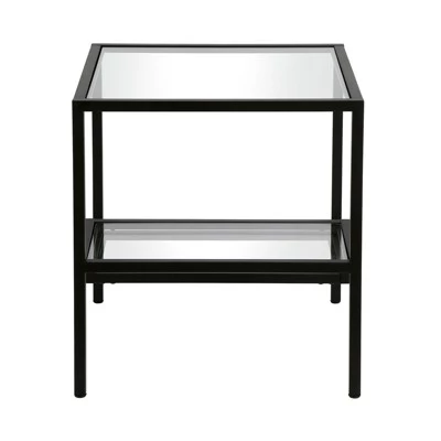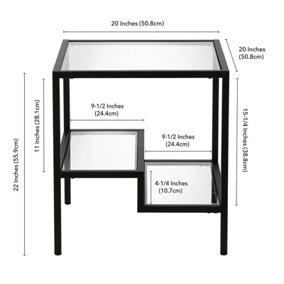 This contemporary side/end table is the perfect addition to your living room or bedroom ensemble. A blackened bronze metal frame borders the glass table top and two-tiered shelves. Balanced on four legs, the table can hold a weight capacity of 15 LBS.Features : Hand crafted blackened bronze finish is applied to the steel frame.Clean with a soft, dry cloth; no harsh chemicals or abrasive cleaning materials.Features easy assembly.Weight capacity can support up to 20 LBS.Premium materials have been used in the making of this productSpecifications : Product Weight : 22.9 lbsFrame Material : Metal
