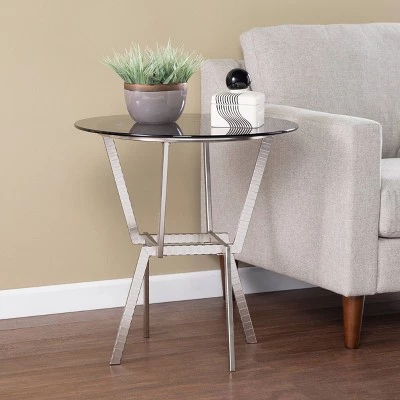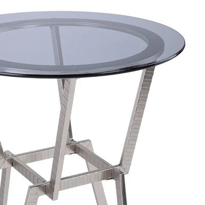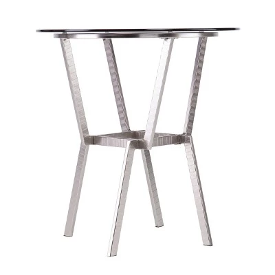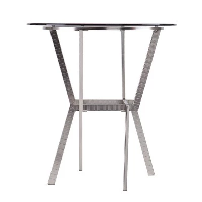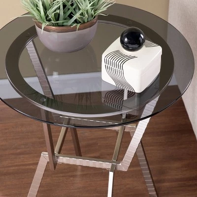Go for a modern look with the Aiden Lane Mawes Round Glass-Top End Table. A unique frame design creates an abstract feel in your living space, while the spacious glass tabletop conveniently holds a reading lamp or framed photos. Blending sleek materials and a small space friendly footprint, this round side table fits neatly alongside your sofa or in your cozy reading nook. Add sophisticated flair to your home when you station this glass-top accent table in your family room or entryway.