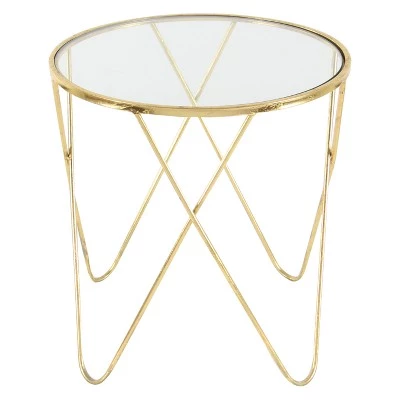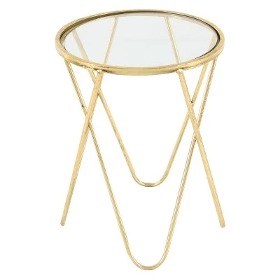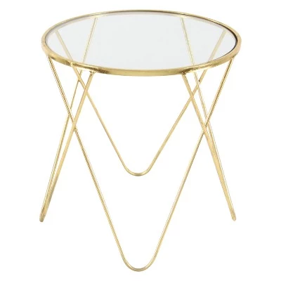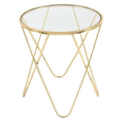- This set of round accent tables flaunts clear glass table tops along with gold frames and hairpin legs