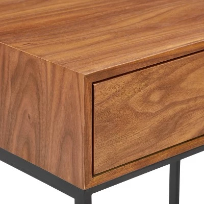 This side table has a small footprint and features a storage drawer with a black leather handle. Taking its design cues from the mid-century modern movement, this accent table has a simple square silhouette and a minimal design with casual sophistication. The black frame on this table is complemented nicely by the warm wood tone and these neutral colors allow for easy placement in rooms of any color.