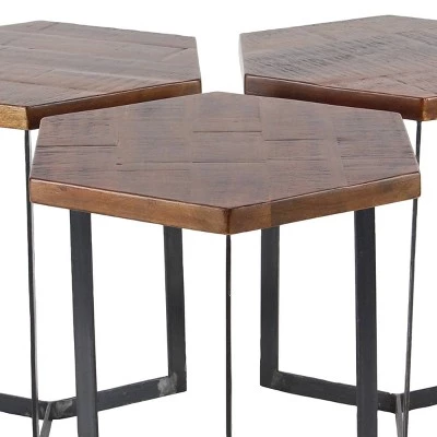 This stylish set of tables is perfect for a contemporary-style den. Bring a finishing touch to your home with an inviting appeal with this beautifully crafted accent table. A compact friendly table providing you with additional storage space any where in your home. Suitable for indoor use only. Maximum weight limit is 100 lbs. Made in India. This set includes three tables. Designed with an industrial theme.