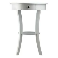 Add this charming Sasha Round Accent Table from Winsome to your living space for a refined look you’ll love. Featuring a round tabletop and flared legs, this white side table has a unique, fanciful look, and the single drawer is finished with a metal drawer pull for a touch of extra detail. The built-in shelf is perfect for books or decor, and the wooden construction makes it strong and stable. Place it in your living room or den to create a curated look that displays your unique taste.