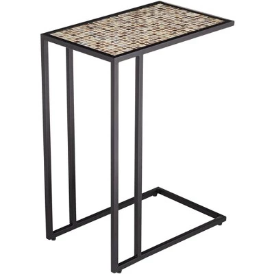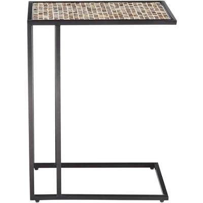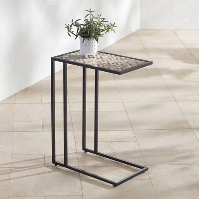 Hold drinks, reading material and more on this handsome mosaic table. The frame is c-shaped, designed so that it can be pulled under chairs or sofas to bring the table surface closer to you. The top features white and brown color tiles that have been hand applied. Can be used indoors or outside.