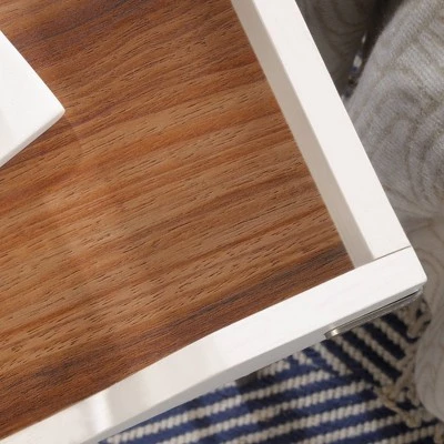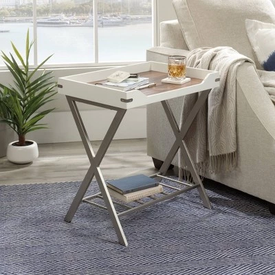 Every couch deserves the perfect side table. Find a place for all your couch-side necessities with this side table from the Vista Key collection. This unique side table features a spacious, attached tray that provides you with the ideal amount of space for items like an accent lamp, the TV remote, coasters, and your refreshing cup of sweet lemonade. The tray doubles as a great spot to display home dΓ©cor items like decorative plants, knick-knacks, and photos of your family. This accent table features a metal frame and lower shelf in a brushed nickel finish. The lower shelf provides you with additional storage space for items like books and magazines. The attached tray is accented with metal corner brackets for an extra touch of detail that is sure to stand out. This side table is finished on all sides so it’ll look great from any angle in your home. Finished in Pearl Oak with Blaze Acacia accents, this attractive end table is just the right accompanying piece to complete your room.