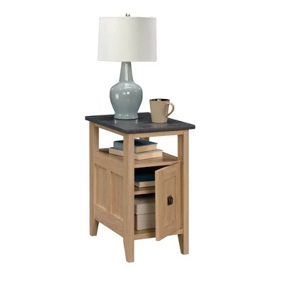 Every couch needs the perfect side kick. Create the perfect place for all your couch side needs while adding a beautiful touch of style and design with this side table from the August Hill collection. This living room end table offers a spacious top surface that provides you with a place for items like an accent lamp, the TV remote, coasters and your hot cup of coffee. The open shelf offers an easy access storage space for items like books, crossword puzzles and your reading glasses. Behind the door is an adjustable shelf that can move to different heights to create flexible storage for items of all shapes and sizes. The reversible door opens to the left or right, whichever fits you best! Attractive from every angle, this storage side table is finished on all sides for versatile placement throughout your home. Finished in Dover Oak® with Slate accents and attractive hardware, this end table will give your room a completed look.