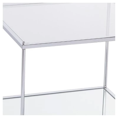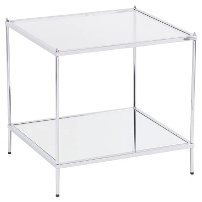 Whether placed beside your couch or sidled up against a bare wall, the Benton Glam Mirrored End Table from Aiden Lane instantly spices things up in your living room. Featuring a minimalist design and sleek lines, this glass end table features a smooth glass tabletop supported on a chrome-plated metal frame, which brings a contemporary flair to your interiors, while the lower glass shelf adds another layer for displaying decor pieces and antiques. A stunning piece to transform your living space, this modern glass end table brings a glamorous focal point to your interiors.