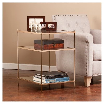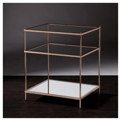 Bring the roaring ’20s to life with this opulently simple Benton Side Table from Aiden Lane. The minimalist architecture contrasts with the luxurious frame, high shine mirrored shelf, and sleek glass tabletop to create a vision Γ la Gatsby. Use the shelves to store your oh-so-gorgeous tchotchkes and/or art deco lamp; make a stunning statement anywhere in your home with this glamorous accent table.