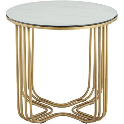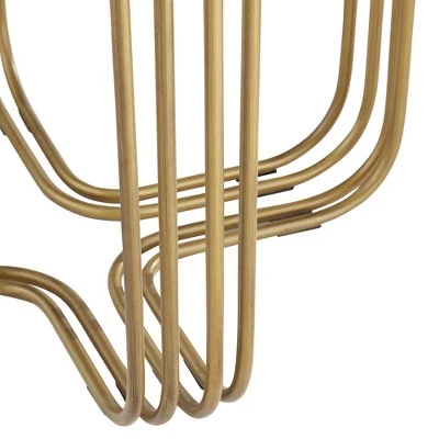 Create a showstopper piece in your living room with the Yuri bronze metal and glass end table. From the Studio 55D brand, this intricate design features a bronze finished metal construction with wavy lines making up the base and top. A marbelized tempered glass plate sits on top, completing the luxe aesthetic.