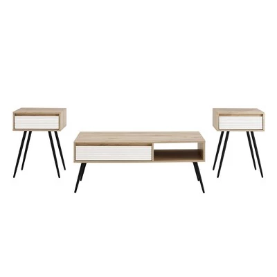 Tie your living room together in a snap with Saracina Homeβs Mid-Century Modern Fluted Drawer Lifted Occasional Table Set. The single cocktail table and two accent tables each feature a stylish fluted drawer where you can store remotes, coasters, or magazines. To add to the abundance of closed storage, the coffee table also includes an open cubby that is accessible from two sides. The pieces feature long, tapered metal legs that step your home up a notch, appealing to the modern decorator in us all.
