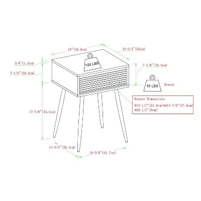 - Side table weight capacities: Top surfaces 100 lbs. each, drawers 15 lbs. each