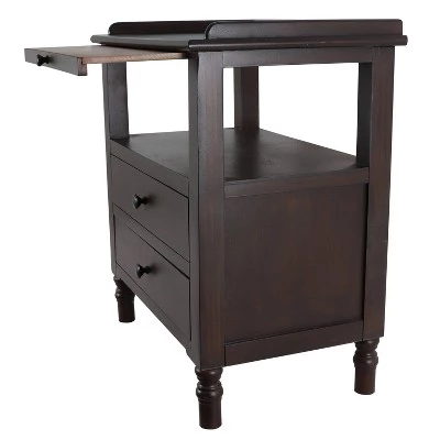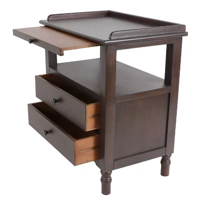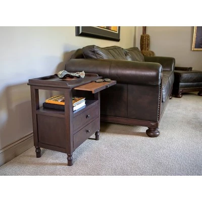Instantly pull your living room ensemble together with the effortless sophistication and functionality of the Timothy Side Table. This timeless end table blends clean, modern lines with traditional elements, including turned legs, to create a transitional look compliments an array of home furnishings and styles. Two storage drawers allow you to keep clutter out of sight, store a throw or house books. Place a basket or artful home accent on the open shelf to maximize your storage opportunities. A small tray pulls out to reveal additional storage, ideal for penning a note or holding a your favorite beverage while you sit and relax. The Timothy side table is stately, yet compact, making it ideal for smaller living spaces as well as larger ones. Place this transitional side table next to a sofa or arm chair to bring warmth, organization and style to your family room bedroom. Constructed of Assorted Solid Wood, MDF and Veneer. Measures 22x14x24″