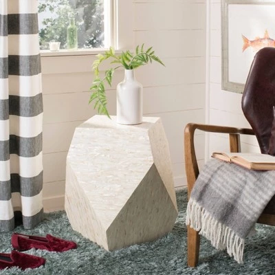 Bold and beautiful, the Lea Mosaiac Geometric side table can instantly transform any living room or bedroom with its modern, contemporary and glamorous style. Designed with lacquered faux mother-of-pearl material, its soft beige combination of neutral tones illuminate its dynamic sculptural form to create a chic, functional focal point. This unique and stylish design helps add to a room by becoming a piece of art in itself. The Lesa Mosaic Geometric does not require assembly.