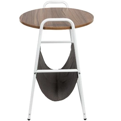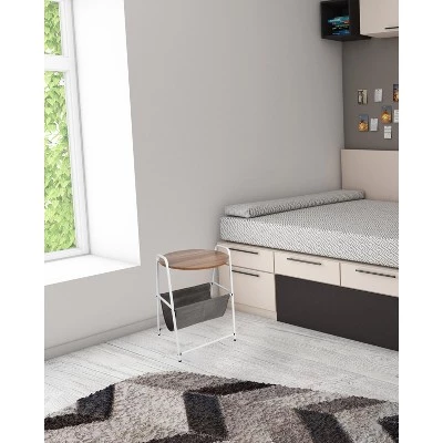 Clean up clutter with the fabric storage pocket on this Mind Reader round end table.Help keep your side table and small spaces clear from clutter with the additional storage pocket on this stylish end table from Mind Reader Products. Too often, it’s easy to let newspapers, books, unopened mail, and other accessories pile up on flat surfaces like coffee tables, end tables, or credenzas. The convenient fabric pocket on this end table provides a tidy way to stash those unsightly accessories out of the way but still within reach, while handles on either side make it extra easy to relocate the table wherever you need it.The sturdy steel and particle board construction offers strong, reliable support for the tabletop and fabric pocket, and won’t bend or warp over time. Rubberized feet protect hardwood floors from scratches while also making sure the table stays in place during use. The straightforward assembly process can be completed in minutes, and the stylish design makes a clean accent to any room where you decide to set the table up. The rustic round design occupies a smaller profile than rectangular tables, making it ideal for use in smaller rooms, like dormitories or studio apartments. Spruce up your living space with a rustic end table from Mind Reader Products that features additional storage space. The overall dimensions are 17.5 L x 18 W x 26.25 H. The storage pockets are 10.75 L x 16 W x 9 D and made from a powder-coating steel.