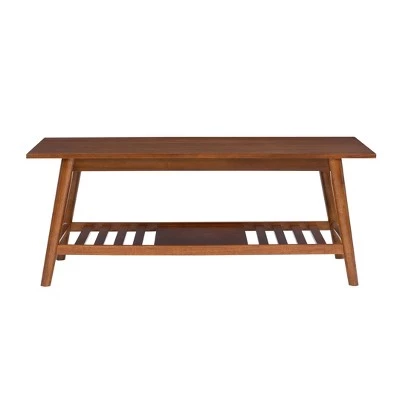 Add a touch of mid-century modern style to your home with this unique three-piece set. The set contains a coffee table with 2 matching end tables made of birch veneer finished in a rich, warm brown. A bottom shelf provides ample space for storage and display. The perfect addition to a media room, living room or sitting area. 3-piece set includes 1 coffee table and 2 end tables which is shipped in 1 box.