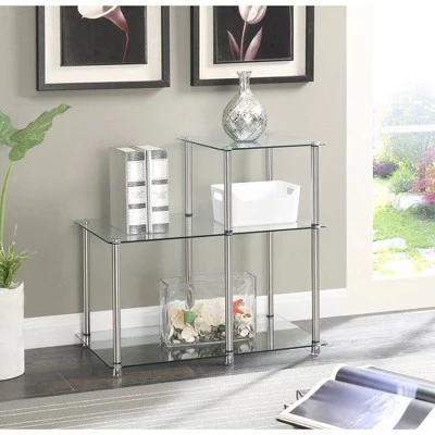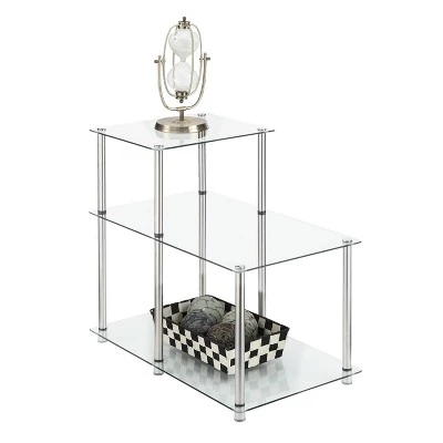 Designs2Go Classic Glass 3 Tier Step End Table by Breighton Home is the perfect complement to any living room decor. Featuring an open concept modern design that provides 3 spacious glass shelves for decoration, collections or art objects. No tools need for assembly as the stainless steel poles twist together with ease and ensure durability. Surely will provide years of enjoyment