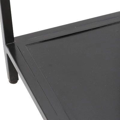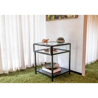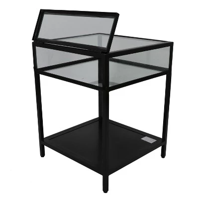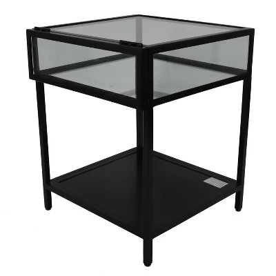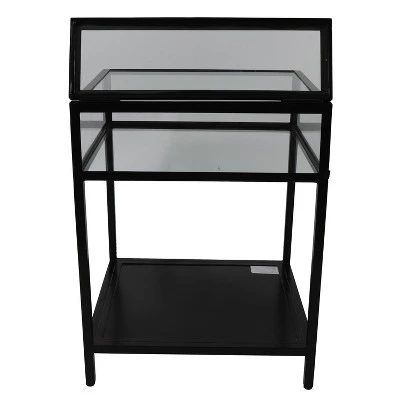 Modern and sleek, this side table offers a unique way to showcase your favorite art or collectibles. The tempered glass tabletop gives way to transparent storage via a hinged door at the front. Matte black metal serves as the table’s frame for classic industrial influence and includes a solid lower shelf for storage versatility.