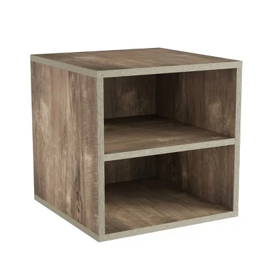 Bring the best of style and function to your home with the Modular Cube Side Table with Double Shelves by Hastings Home. The modern, clean lines and chic, updated style bring casual elegance to your home. The table is constructed from sturdy manufactured wood that supports a 22-pound weight capacity on each shelf as well as the table top. It can be used freestanding on its own, side by side with another to create a coffee table or with bracing kits to stack for vertical shelving. The end table can be assembled easily with the included hardware and convenient, pre-drilled holes on each piece of the unit. The open front and two fixed 7-inch high shelves are great for displaying and organizing a variety of items like books, magazines, collectibles and even vinyl records! The rustic wood grain look of this side table is sure to enhance your living space decor.