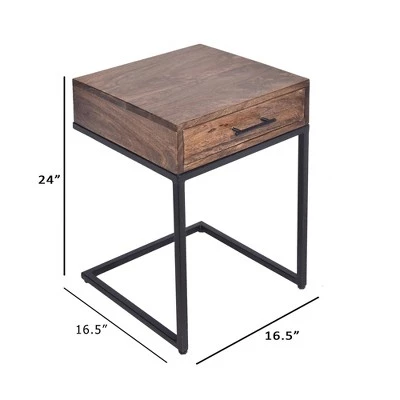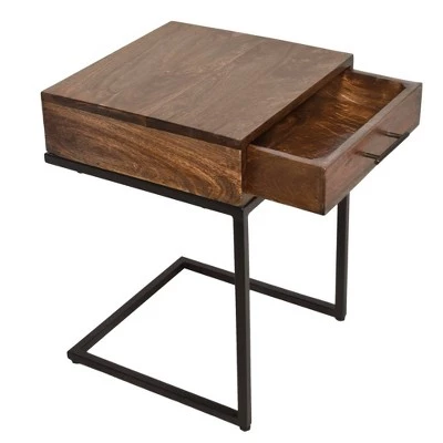 An essential addition to your living room, bedroom and a sidekick to your sofa or chair, this side table provides a versatile usage while adding to its unique style. It is constructed from durable wood finished in brown and combined with a sturdy black finish iron cantilever base which allows you to slide it under the sofa to keep your beverages, snacks, remote, within reach. With a weight capacity of 30 lbs., it can easy hold necessary items in the drawer provided with an attached handle. It has visible wood grain details that adds a visual interest while you can use the top for decorative displays.