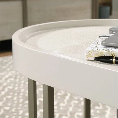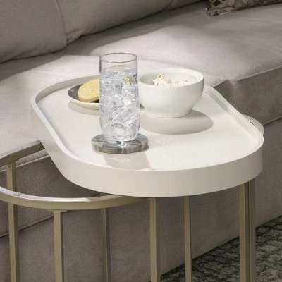 The perfect side table does exist. Give your home the style it deserves with the modern appeal and farmhouse charm of this side table from the Manhattan Gate collection. This unique end table offers a spacious top surface that provides you with room for items like the TV remote, coasters, decorative plants, and your hot cup of coffee. The top also lifts off and functions as a removable tray so you can serve your guests in style. The top is detailed with a pebble texture to give it a one-of-a-kind style that is sure to stand out in your home. This side table features a powder coated metal frame with a sturdy base and six strong legs. This couch-side table is finished on all sides for versatile placement throughout any room in your home.. Finished in Ivory, this stunning side table is just what your home has been looking for.