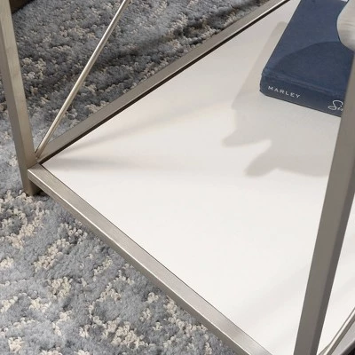 No couch is complete without the perfect side table. Find a place for all your couch-side needs while adding a touch beautiful style and design with this side table from the Vista Key collection. This stunning end table features a safety-tempered glass top that offers the ideal amount of room for items like an accent lamp, decorative plants, coasters and a refreshing ice-cold beverage. This side table also includes a lower shelf with a reversible bottom that features a Peal Oak or Blaze Acacia finish. Its sturdy metal frame features a brushed nickel finish that is sure to stand out in your home. This end table also features crossbars for stability that add an extra touch of detail. This couch-side table is finished on all sides for versatile placement throughout any room in your home – the living room, your office, or even the dining room. Finished in Pearl Oak or Blaze Acacia, this stunning side table is just what your home is missing.