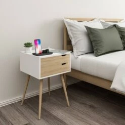 Clean line in design and mid-century in aesthetic, the Blythe 2-Drawer Side Table just might be the piece to add the finishing touch to the room. Compact and modest, the streamlined design echoes retro with a modern twist, with two natural wood finish drawers that feature a hip slotted drawer pull design. Great as a bedside table or end table by the sofa, this is sure to keep items out of view while doing double duty as a table. Two USB ports are built right into the tabletop for your convenience. The glossy, scratch-resistant paint finish of the table is complemented by the natural wood dowel legs, keeping a true retro yet urban feel. This lightweight yet durable table is easy to move around and easy to clean.